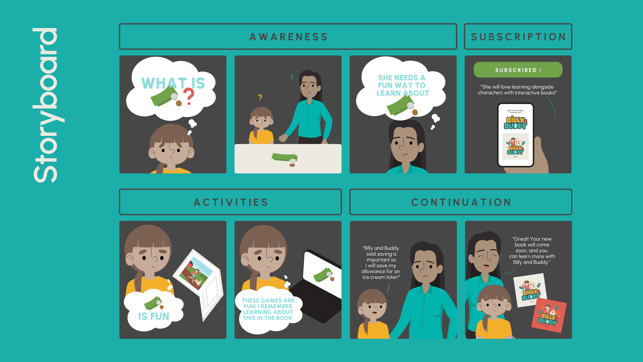 This is a children's book series that follows characters as they tackle real world financial problems. Each book fosters financial literacy comprehension through text, comic-strip style illustration, and on-page physical interactions.